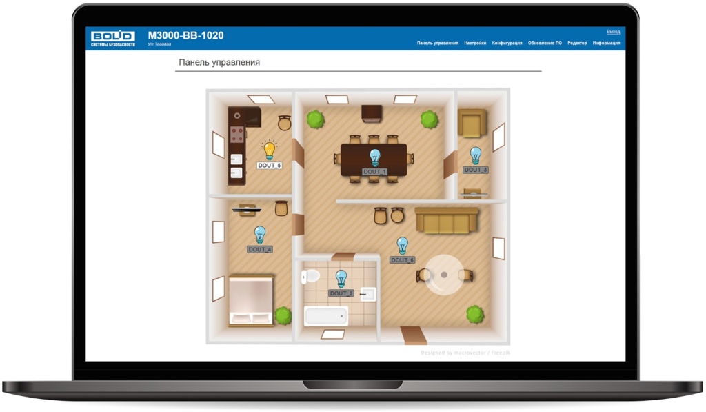 «М3000-ВВ-1020» имеет возможность отображать состояние входов и выходов, а также управлять выходами и изменять конфигурацию через веб-интерфейс по сети Wi-Fi. Специальное ПО при этом не требуется. Веб-интерфейс позволяет загружать подложку плана помещения и расставлять на нем интерактивные управляемые элементы.