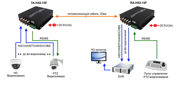 Максимальное количество камер видеонаблюдения(16 видеокамер) можно подключить к разъемам BNC передатчика TA-H162-15F. Для этой модели передатчика подойдет приемник RA-H162-15F, к выходным разъемам которого необходимо подключить видеорегистратор.