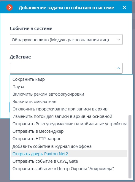 - Выполнять действие в системе Paxton Net2 при возникновении события в Macroscop. Например, открыть определенную дверь СКУД при обнаружении лица видеосистемой.
