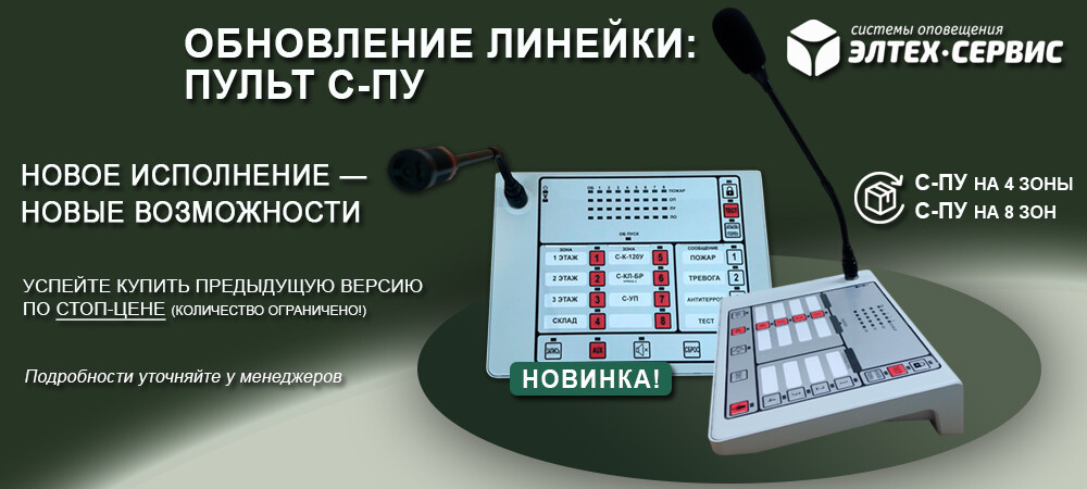 В продажу компании "Элтех-сервис" поступил Пульт управления речевым оповещением С-ПУ на 4 зоны (с микрофоном) и С-ПУ на 8 зон (с микрофоном) в новом, усовершенствованном исполнении.