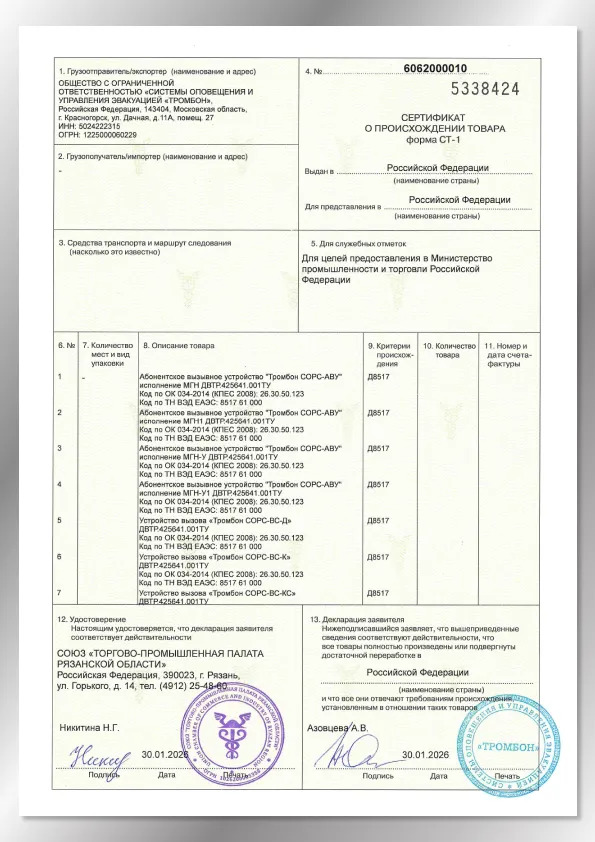 Сертификат СТ-1 подтверждает прозрачность происхождения продукции и ее российское производство. Это означает, что оборудование «СОУЭ «Тромбон» соответствует требованиям государственных программ, политики импортозамещения и может применяться на объектах, где предъявляются повышенные требования к подтверждению страны происхождения оборудования.