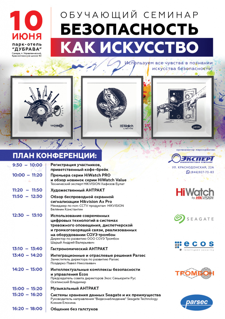 Специалисты компаний СОУЭ Тромбон, Эксперт, Hiwatch, Seagate, Ecos и Parsec проведут для вас обучающий семинар "Безопасность как искусство" в Самаре.