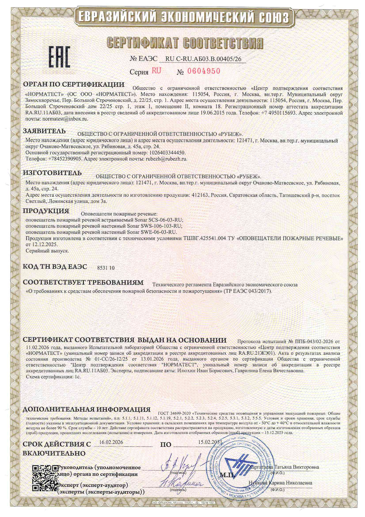 Компания РУБЕЖ получила сертификат соответствия Евразийского экономического союза (№ RU C-RU.АБ03.В.00405/26) на три модели пожарных речевых оповещателей SONAR: