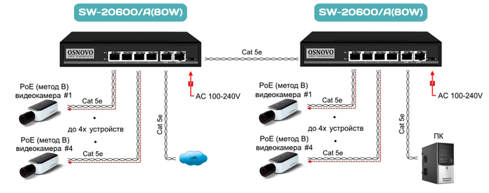 Коммутатор SW-20600/A(80W) может быть с успехом использован для организации систем видеонаблюдения, удаленного подключения PoE устройств, таких как: IP-камеры, IP-телефоны, точки доступа и т.п.