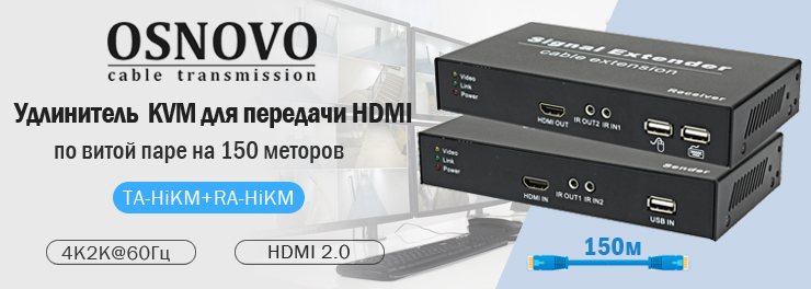 Передача HDMI разрешением 4K2K@60Гц и сигналов управления по витой паре на 150 м.