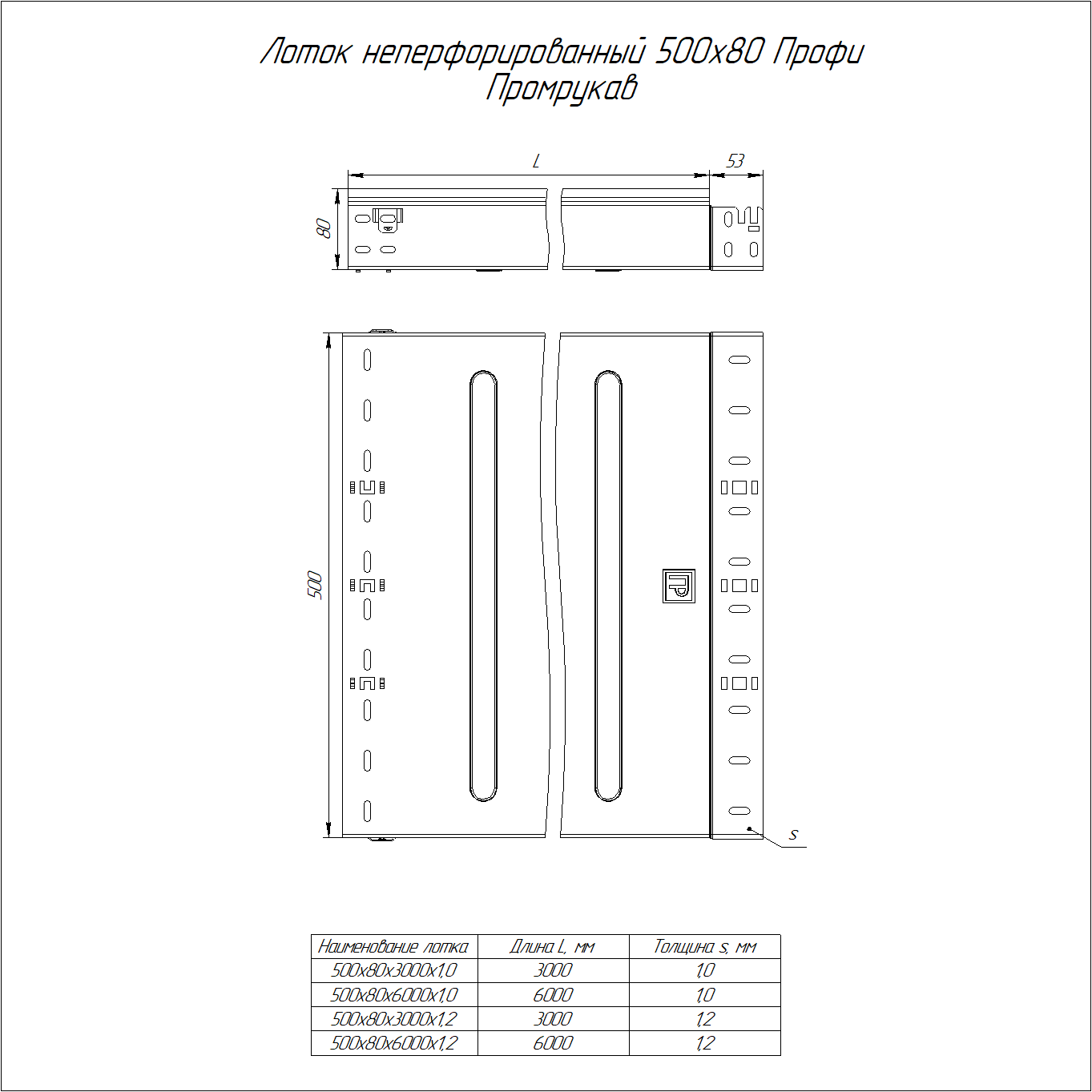 PR16.12819 лоток неперфорированный Профи 500х80х3000 (1,0 мм) (6 м/уп) Промрукав; сталь; УХЛ2; толщина материала 1 мм; монтаж -60...100 °C; эксплуатация -80...150 °C; 5,56428 кг/м.