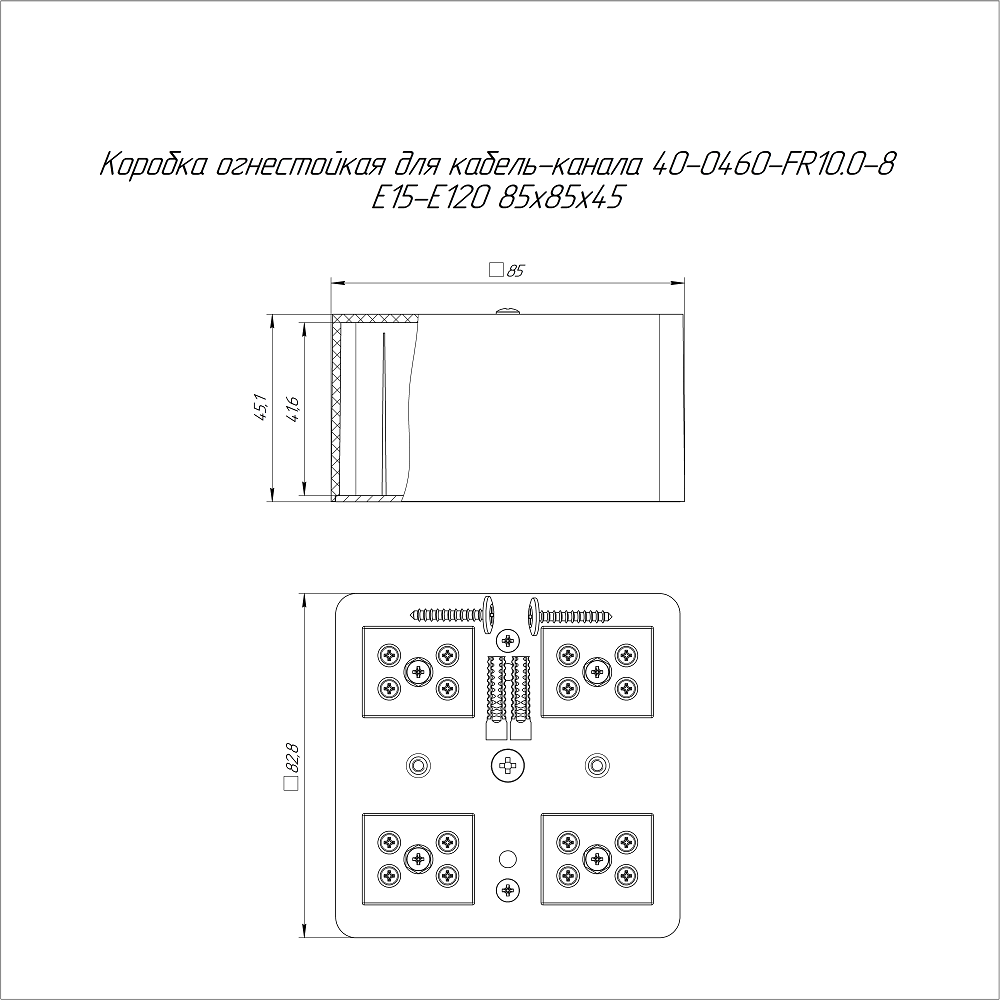 40-0460-9005-FR10.0-8 коробка огнестойкая для кабель-канала 40-0460-FR10.0-8 Е15-Е120 RAL9005 85х85х45 (44 шт/кор) Промрукав; пластик; УХЛ4, Т4; 8 полюсов; IP42; монтаж -5...60 °C; эксплуатация -25...40 °C; 0,2789 кг/шт.