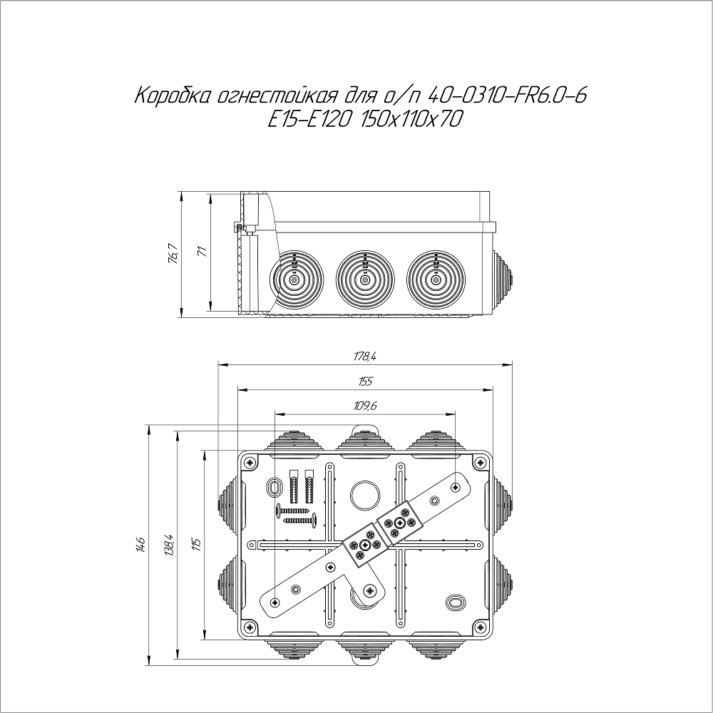 40-0310-9005-FR6.0-6 коробка огнестойкая для о/п 40-0310-FR6.0-6 Е15-Е120 RAL9005 150х110х70 (6 шт/кор) Промрукав; пластик; УХЛ4, Т4; 6 полюсов; IP55; монтаж -5...60 °C; эксплуатация -25...40 °C; 0,4491 кг/шт.