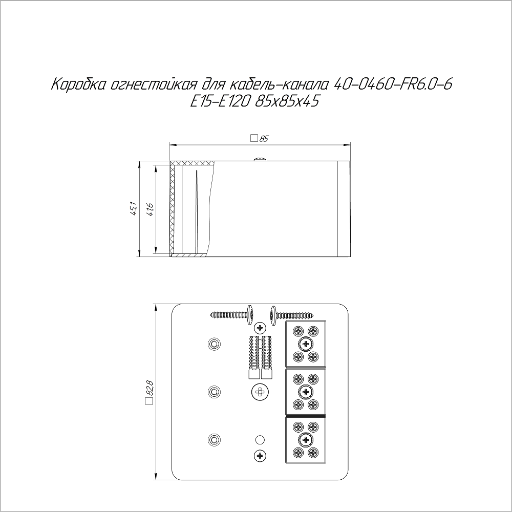 40-0460-9005-FR6.0-6 коробка огнестойкая для кабель-канала 40-0460-FR6.0-6 Е15-Е120 RAL9005 85х85х45 (44 шт/кор) Промрукав; пластик; УХЛ4, Т4; 6 полюсов; IP42; монтаж -5...60 °C; эксплуатация -25...40 °C; 0,2549 кг/шт.