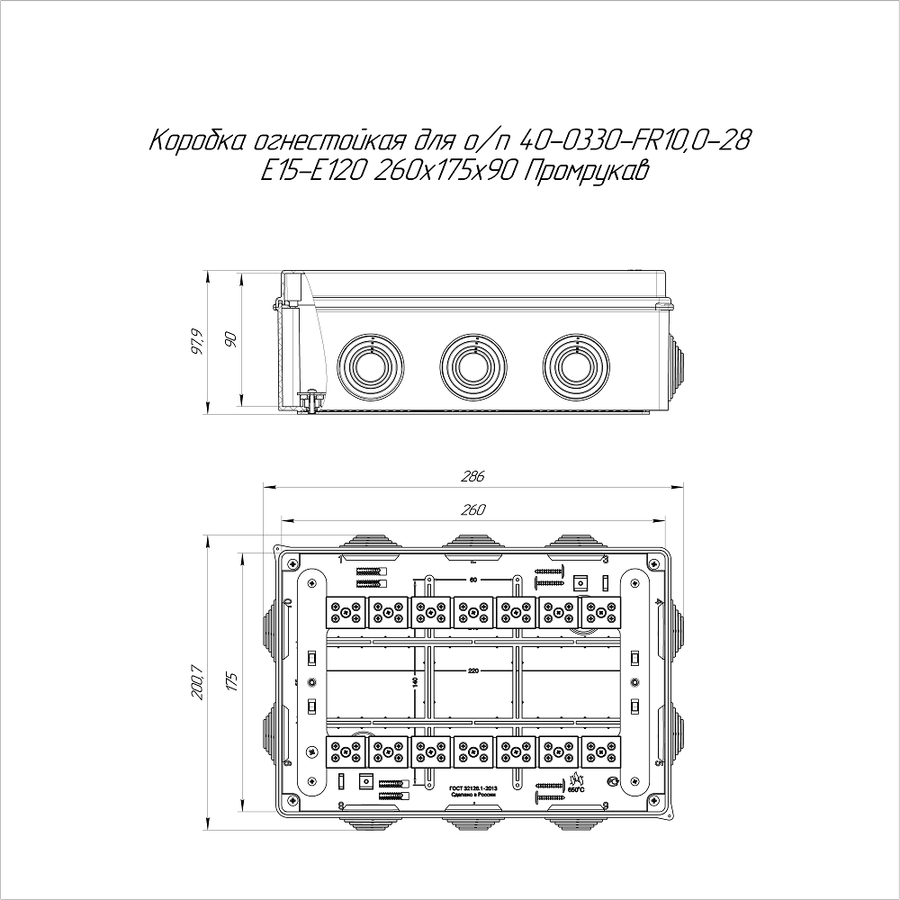 40-0330-9005-FR10.0-28 коробка огнестойкая для о/п 40-0330-FR10.0-28 Е15-Е120 RAL9005 260х175х90 (7 шт/кор) Промрукав; пластик; УХЛ4, Т4; 28 полюсов; IP55; монтаж -5...60 °C; эксплуатация -25...40 °C; 1,1523 кг/шт.