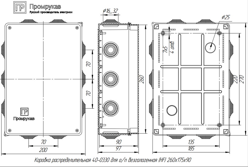 40-0330 коробка распаячная для о/п 260х175х90 Промрукав; безгалогенная; 10 вводов; IP55; 260х175х90; t-раб.: -25...+40°С; 0,5717кг.