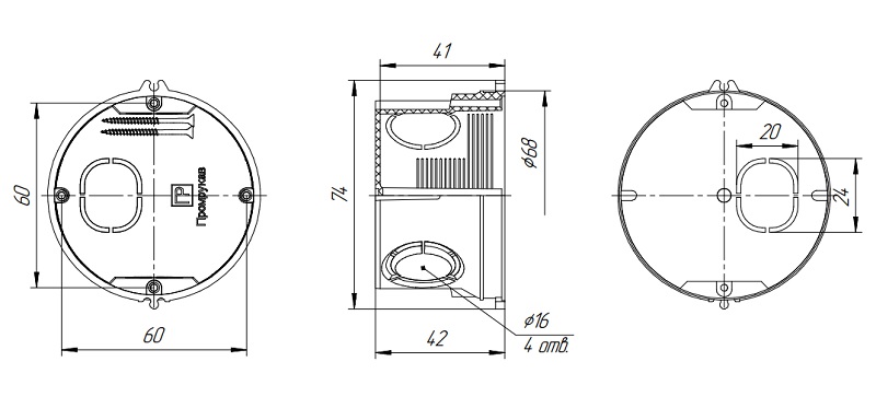 80-0501С коробка установочная с саморезами без соединителя 68x42 Промрукав ; безгалогенная; 7 вводов; IP20; 68x42 мм; t-раб.: -25…+40°С; 0,01968кг.