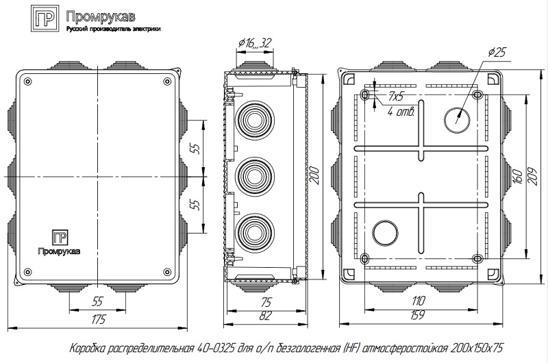 40-0325 коробка распределительная для о/п 200х150х75 Промрукав; безгалогенная; атмосферостойкая; IP55; 200х150х75; t-раб.: -25...+40°С; 0,40412кг.