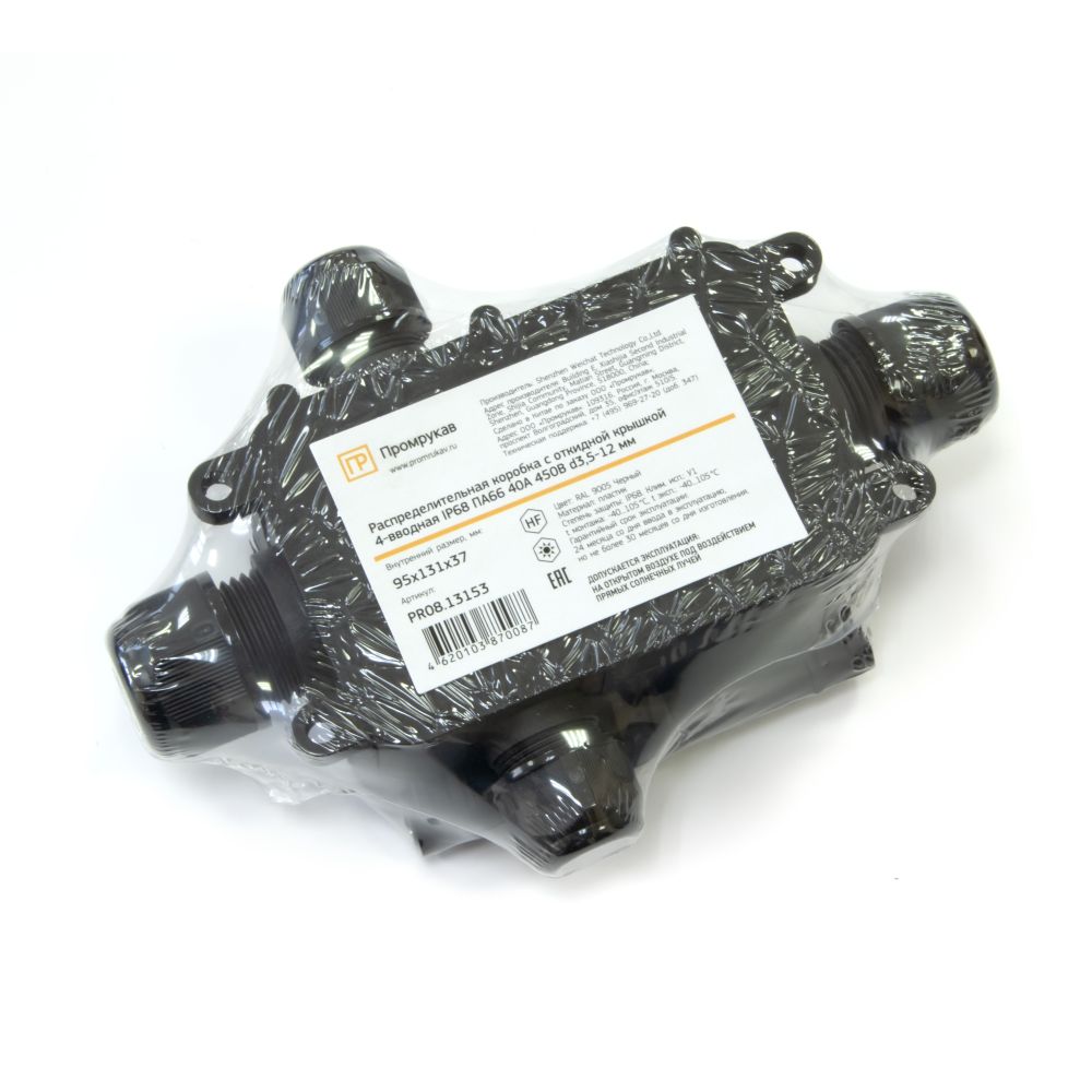 PR08.13153 распределительная коробка с откидной крышкой 4-вводная Промрукав; IP68; ПА66; 40А; 450В; d3,5-12 мм; монтаж -40...105 °C; эксплуатация -40...105 °C; 131х95х37 мм; 0,1259 кг/шт.