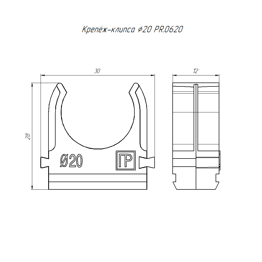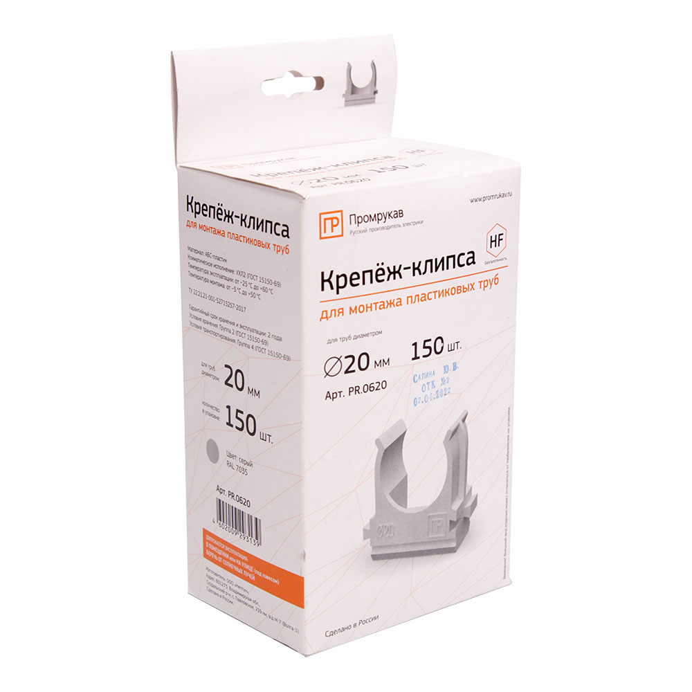 PR.0620 крепеж-клипса для труб АБС-пластик в карт d20 мм (150шт/1500шт уп/кор) Промрукав; пластик; диаметр 20 мм; УХЛ2; монтаж -5...50 °C; эксплуатация -60...60 °C; 0,00315 кг/шт.