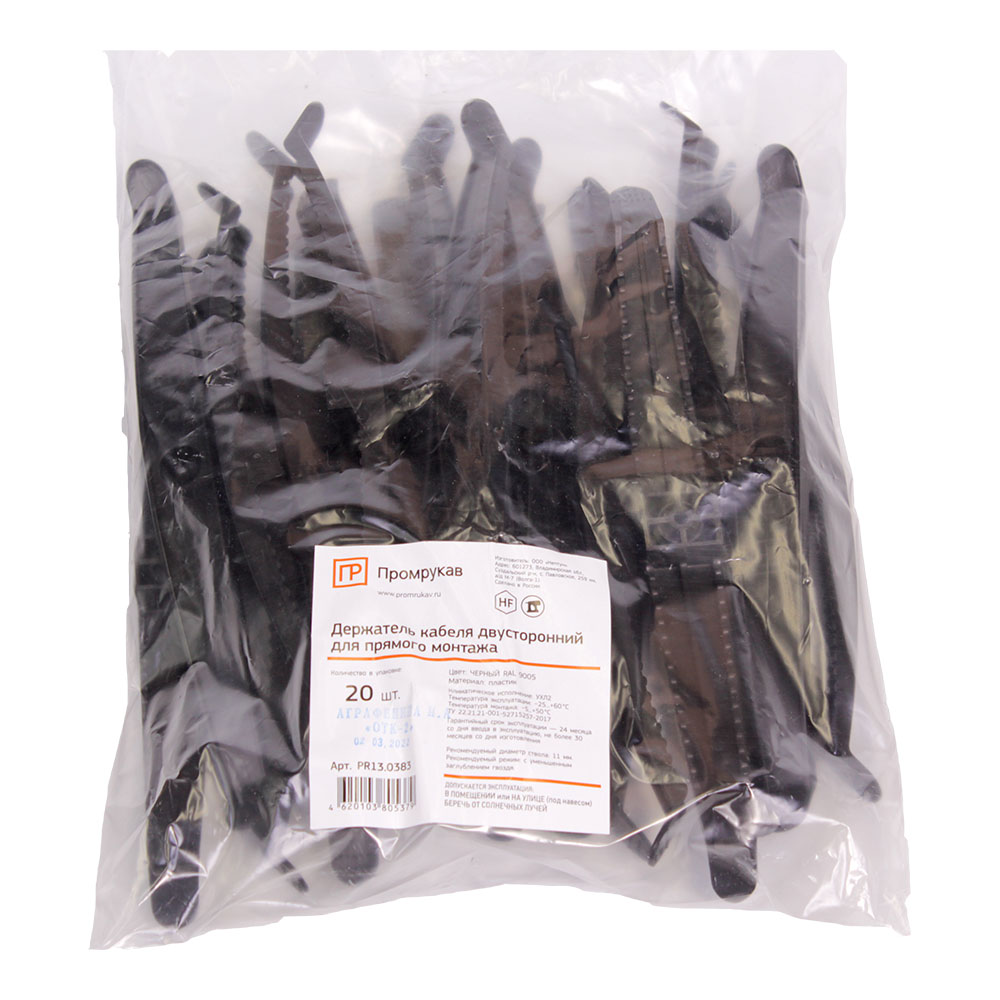 PR13.0383 держатель кабеля двусторонний для прямого монтажа черный (20шт/120шт уп/кор) Промрукав; пластик; УХЛ2; RAL 9005; -60..+60°C; 0,01915 кг.