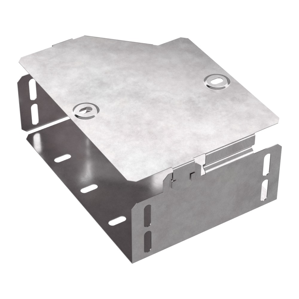 Аксессуары изготовленные из стали с защитным покрытием по методу Сендзимира – это изделия, на которых защитное цинковое покрытие было нанесено на листовую сталь перед изготовлением. Толщина защитного покрытия варьируется от 10 до 22мкм. Климатическое исполнение изделий УХЛ2, что предусматривают эксплуатацию в помещении и под навесом, при температуре эксплуатации от -80 до +150°С. Переходник правый предназначен для перехода с одной ширины лотка на другую. В комплект входит крышка.