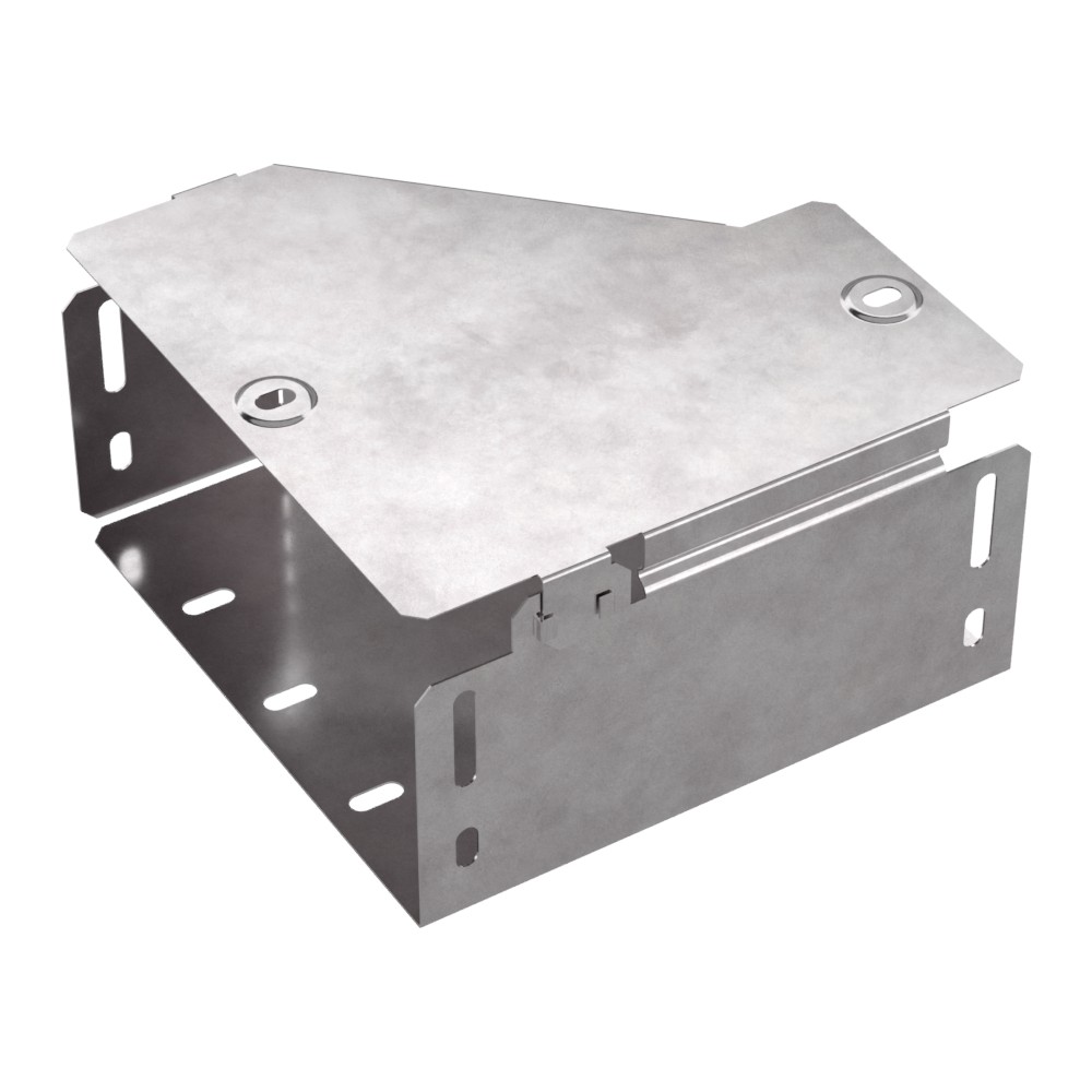 Аксессуары изготовленные из стали с защитным покрытием по методу Сендзимира – это изделия, на которых защитное цинковое покрытие было нанесено на листовую сталь перед изготовлением. Толщина защитного покрытия варьируется от 10 до 22мкм. Климатическое исполнение изделий УХЛ2, что предусматривают эксплуатацию в помещении и под навесом, при температуре эксплуатации от -80 до +150°С. Переходник правый предназначен для перехода с одной ширины лотка на другую. В комплект входит крышка.