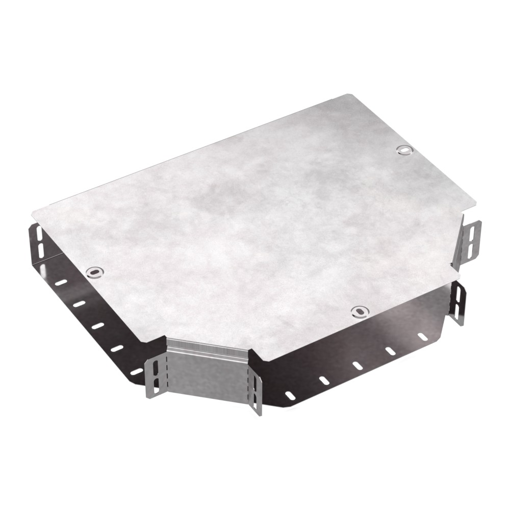 Аксессуары изготовленные из стали с защитным покрытием по методу Сендзимира – это изделия, на которых защитное цинковое покрытие было нанесено на листовую сталь перед изготовлением. Толщина защитного покрытия варьируется от 10 до 22мкм. Климатическое исполнение изделий УХЛ2, что предусматривают эксплуатацию в помещении и под навесом, при температуре эксплуатации от -80 до +150°С. Т-образный ответвитель предназначен для разветвления кабельных трасс в горизонтальном направлении,для перфорированных и глухих лотков. В комплект входит крышка.