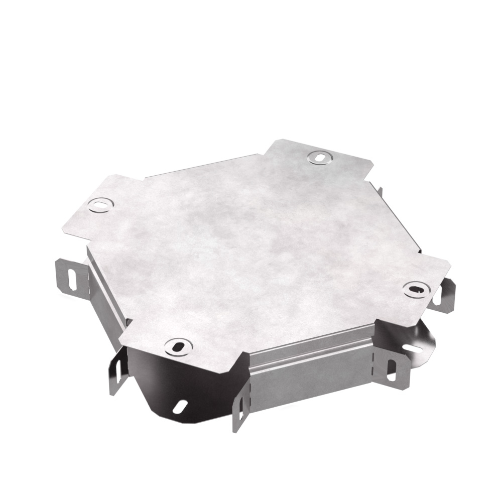 Аксессуары изготовленные из стали с защитным покрытием по методу Сендзимира – это изделия, на которых защитное цинковое покрытие было нанесено на листовую сталь перед изготовлением. Толщина защитного покрытия варьируется от 10 до 22мкм. Климатическое исполнение изделий УХЛ2, что предусматривают эксплуатацию в помещении и под навесом, при температуре эксплуатации от -80 до +150°С. Ответвитель X-образный предназначен для разветвления кабельных трасс в горизонтальном направлении, для перфорированных и глухих лотков. В комплект входит крышка.