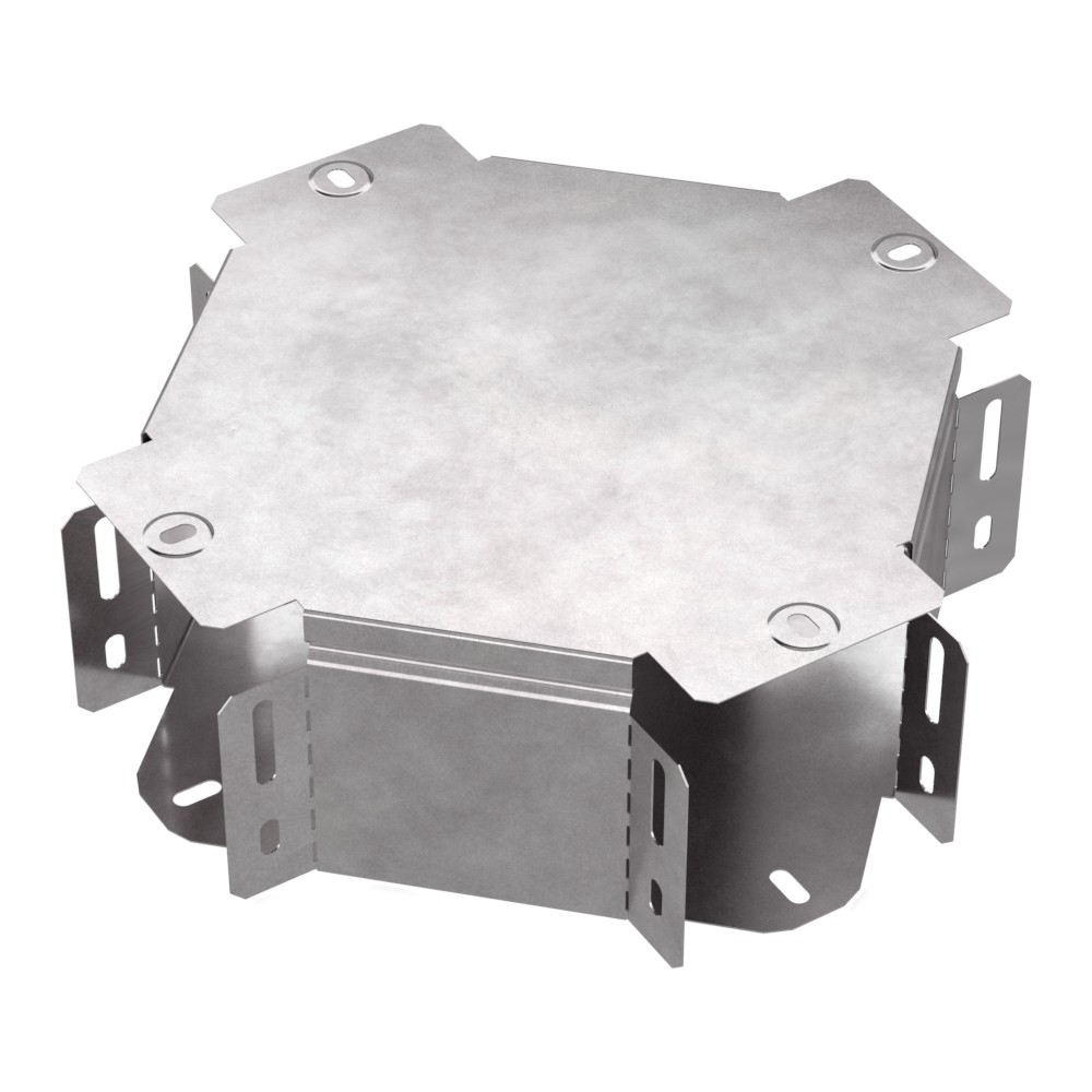 Аксессуары изготовленные из стали с защитным покрытием по методу Сендзимира – это изделия, на которых защитное цинковое покрытие было нанесено на листовую сталь перед изготовлением. Толщина защитного покрытия варьируется от 10 до 22мкм. Климатическое исполнение изделий УХЛ2, что предусматривают эксплуатацию в помещении и под навесом, при температуре эксплуатации от -80 до +150°С. Ответвитель X-образный предназначен для разветвления кабельных трасс в горизонтальном направлении, для перфорированных и глухих лотков. В комплект входит крышка.