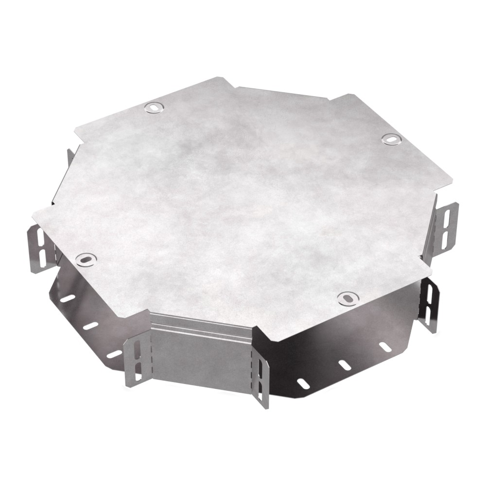 Аксессуары изготовленные из стали с защитным покрытием по методу Сендзимира – это изделия, на которых защитное цинковое покрытие было нанесено на листовую сталь перед изготовлением. Толщина защитного покрытия варьируется от 10 до 22мкм. Климатическое исполнение изделий УХЛ2, что предусматривают эксплуатацию в помещении и под навесом, при температуре эксплуатации от -80 до +150°С. Ответвитель X-образный предназначен для разветвления кабельных трасс в горизонтальном направлении, для перфорированных и глухих лотков. В комплект входит крышка.