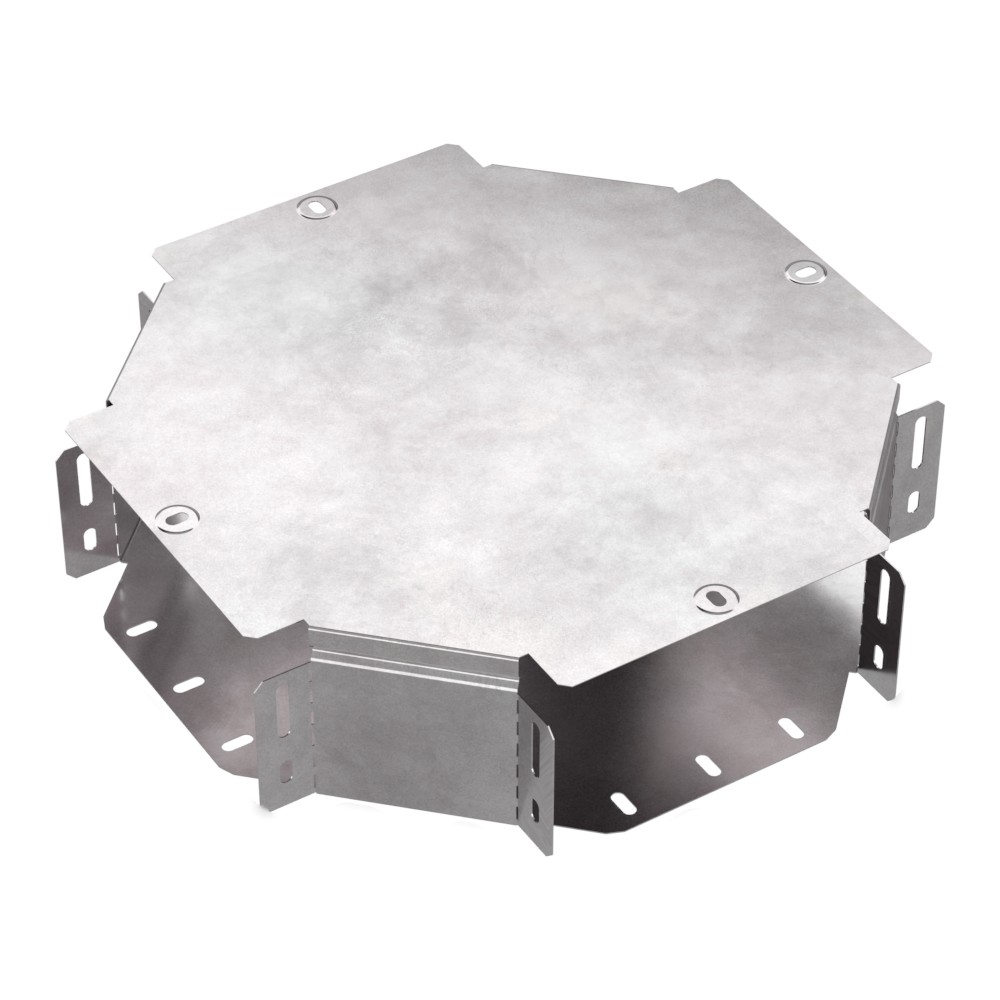 Аксессуары изготовленные из стали с защитным покрытием по методу Сендзимира – это изделия, на которых защитное цинковое покрытие было нанесено на листовую сталь перед изготовлением. Толщина защитного покрытия варьируется от 10 до 22мкм. Климатическое исполнение изделий УХЛ2, что предусматривают эксплуатацию в помещении и под навесом, при температуре эксплуатации от -80 до +150°С. Ответвитель X-образный предназначен для разветвления кабельных трасс в горизонтальном направлении, для перфорированных и глухих лотков. В комплект входит крышка.
