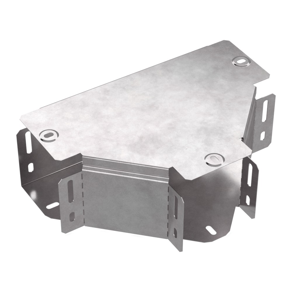 Аксессуары изготовленные из стали с защитным покрытием по методу Сендзимира – это изделия, на которых защитное цинковое покрытие было нанесено на листовую сталь перед изготовлением. Толщина защитного покрытия варьируется от 10 до 22мкм. Климатическое исполнение изделий УХЛ2, что предусматривают эксплуатацию в помещении и под навесом, при температуре эксплуатации от -80 до +150°С. Т-образный ответвитель предназначен для разветвления кабельных трасс в горизонтальном направлении, для перфорированных и глухих лотков. В комплект входит крышка.