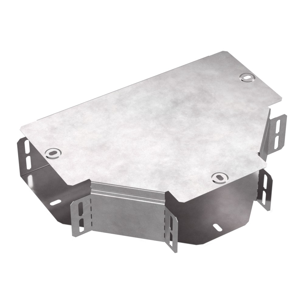 Аксессуары изготовленные из стали с защитным покрытием по методу Сендзимира – это изделия, на которых защитное цинковое покрытие было нанесено на листовую сталь перед изготовлением. Толщина защитного покрытия варьируется от 10 до 22мкм. Климатическое исполнение изделий УХЛ2, что предусматривают эксплуатацию в помещении и под навесом, при температуре эксплуатации от -80 до +150°С. Т-образный ответвитель предназначен для разветвления кабельных трасс в горизонтальном направлении,для перфорированных и глухих лотков. В комплект входит крышка.