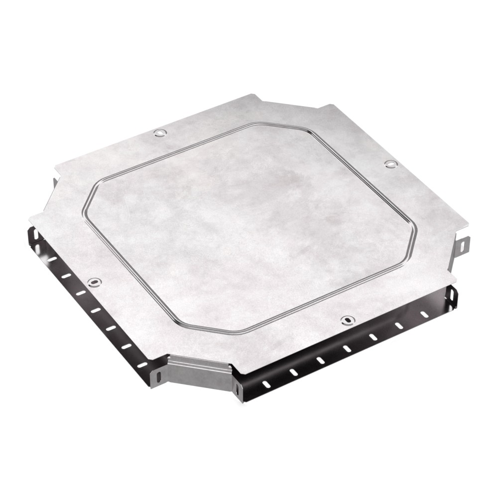 Аксессуары изготовленные из стали с защитным покрытием по методу Сендзимира – это изделия, на которых защитное цинковое покрытие было нанесено на листовую сталь перед изготовлением. Толщина защитного покрытия варьируется от 10 до 22мкм. Климатическое исполнение изделий УХЛ2, что предусматривают эксплуатацию в помещении и под навесом, при температуре эксплуатации от -80 до +150°С. Ответвитель X-образный предназначен для разветвления кабельных трасс в горизонтальном направлении, для перфорированных и глухих лотков. В комплект входит крышка.