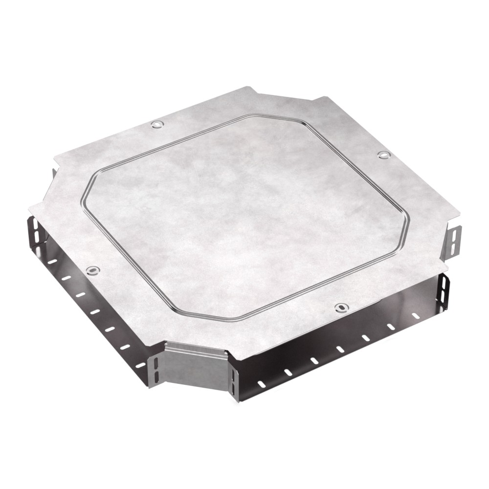 Аксессуары изготовленные из стали с защитным покрытием по методу Сендзимира – это изделия, на которых защитное цинковое покрытие было нанесено на листовую сталь перед изготовлением. Толщина защитного покрытия варьируется от 10 до 22мкм. Климатическое исполнение изделий УХЛ2, что предусматривают эксплуатацию в помещении и под навесом, при температуре эксплуатации от -80 до +150°С. Ответвитель X-образный предназначен для разветвления кабельных трасс в горизонтальном направлении, для перфорированных и глухих лотков. В комплект входит крышка.