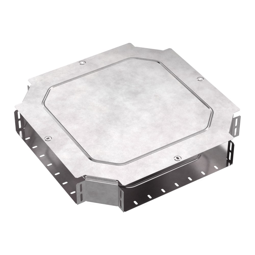 Аксессуары изготовленные из стали с защитным покрытием по методу Сендзимира – это изделия, на которых защитное цинковое покрытие было нанесено на листовую сталь перед изготовлением. Толщина защитного покрытия варьируется от 10 до 22мкм. Климатическое исполнение изделий УХЛ2, что предусматривают эксплуатацию в помещении и под навесом, при температуре эксплуатации от -80 до +150°С. Ответвитель X-образный предназначен для разветвления кабельных трасс в горизонтальном направлении, для перфорированных и глухих лотков. В комплект входит крышка.