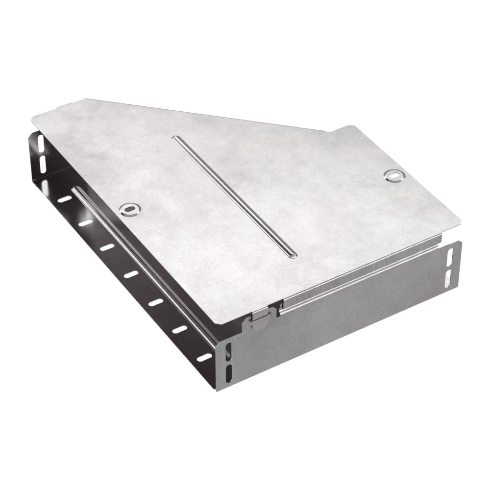 Аксессуары изготовленные из стали с защитным покрытием по методу Сендзимира – это изделия, на которых защитное цинковое покрытие было нанесено на листовую сталь перед изготовлением. Толщина защитного покрытия варьируется от 10 до 22мкм. Климатическое исполнение изделий УХЛ2, что предусматривают эксплуатацию в помещении и под навесом, при температуре эксплуатации от -80 до +150°С. Переходник правый предназначен для перехода с одной ширины лотка на другую. В комплект входит крышка.