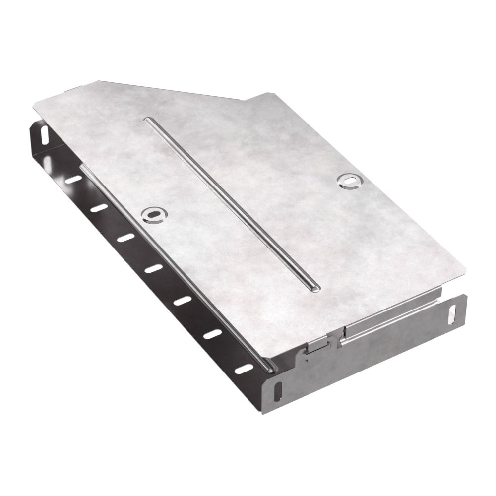 Аксессуары изготовленные из стали с защитным покрытием по методу Сендзимира – это изделия, на которых защитное цинковое покрытие было нанесено на листовую сталь перед изготовлением. Толщина защитного покрытия варьируется от 10 до 22мкм. Климатическое исполнение изделий УХЛ2, что предусматривают эксплуатацию в помещении и под навесом, при температуре эксплуатации от -80 до +150°С. Переходник правый предназначен для перехода с одной ширины лотка на другую. В комплект входит крышка.