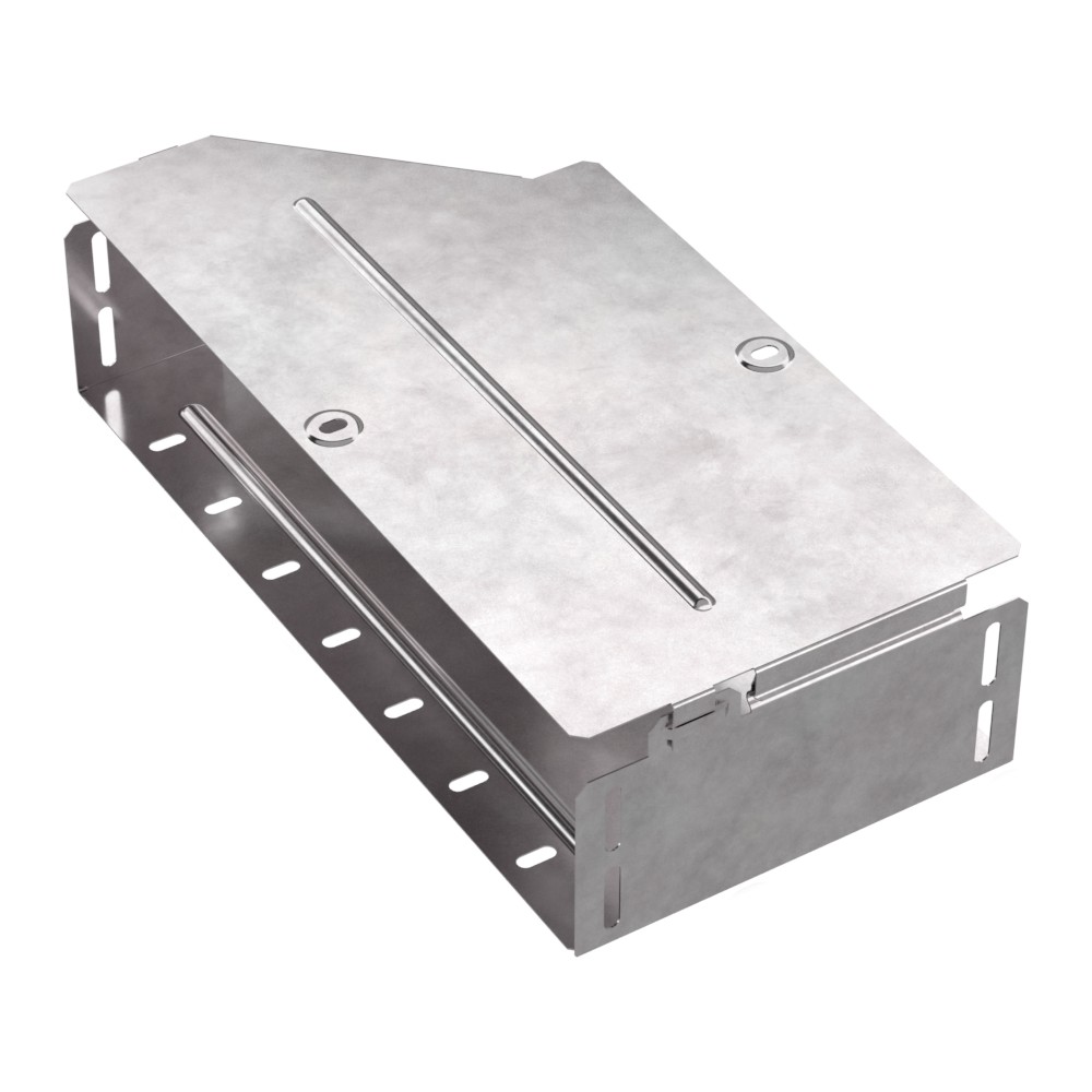 Аксессуары изготовленные из стали с защитным покрытием по методу Сендзимира – это изделия, на которых защитное цинковое покрытие было нанесено на листовую сталь перед изготовлением. Толщина защитного покрытия варьируется от 10 до 22мкм. Климатическое исполнение изделий УХЛ2, что предусматривают эксплуатацию в помещении и под навесом, при температуре эксплуатации от -80 до +150°С. Переходник правый предназначен для перехода с одной ширины лотка на другую. В комплект входит крышка.
