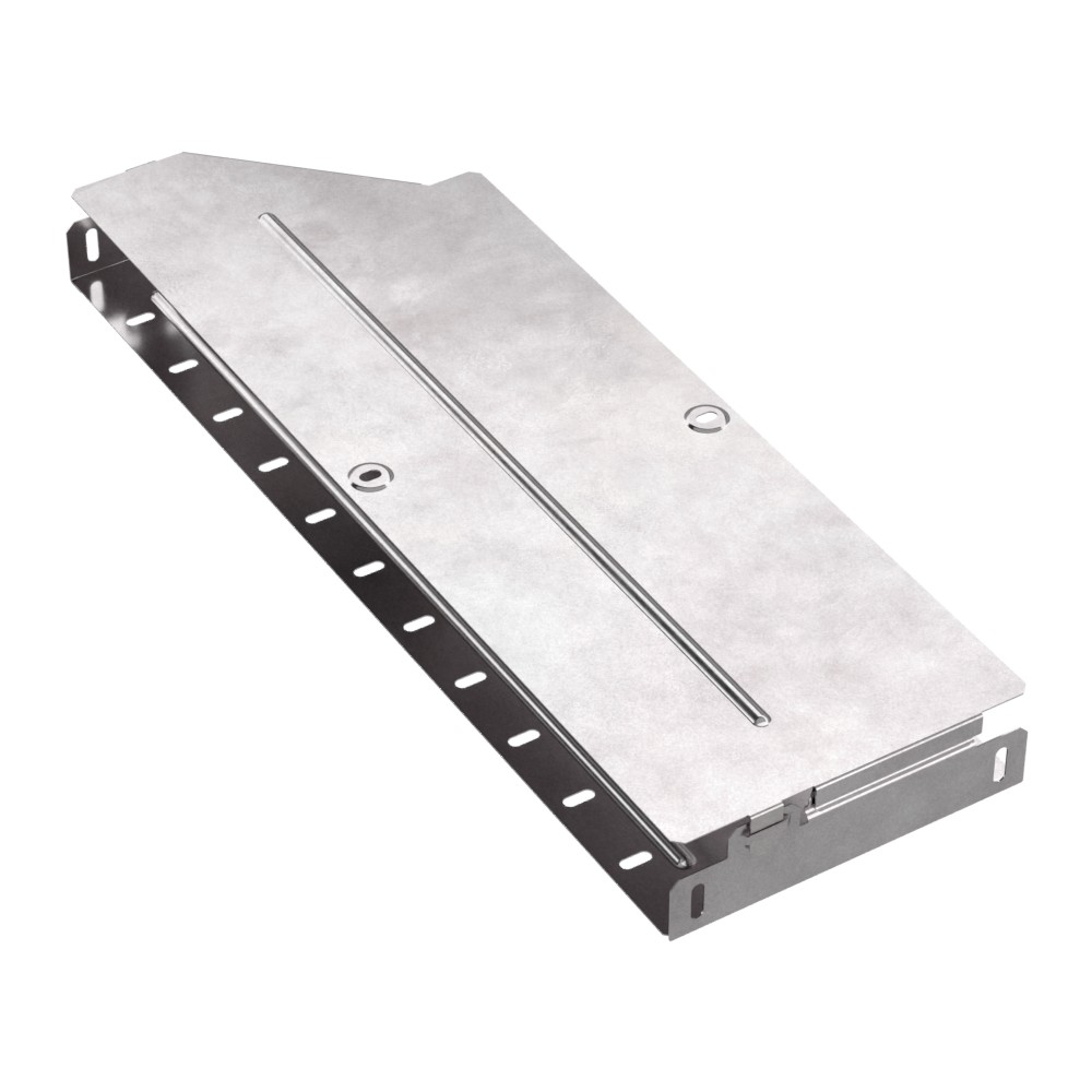 Аксессуары изготовленные из стали с защитным покрытием по методу Сендзимира – это изделия, на которых защитное цинковое покрытие было нанесено на листовую сталь перед изготовлением. Толщина защитного покрытия варьируется от 10 до 22мкм. Климатическое исполнение изделий УХЛ2, что предусматривают эксплуатацию в помещении и под навесом, при температуре эксплуатации от -80 до +150°С. Переходник правый предназначен для перехода с одной ширины лотка на другую. В комплект входит крышка.