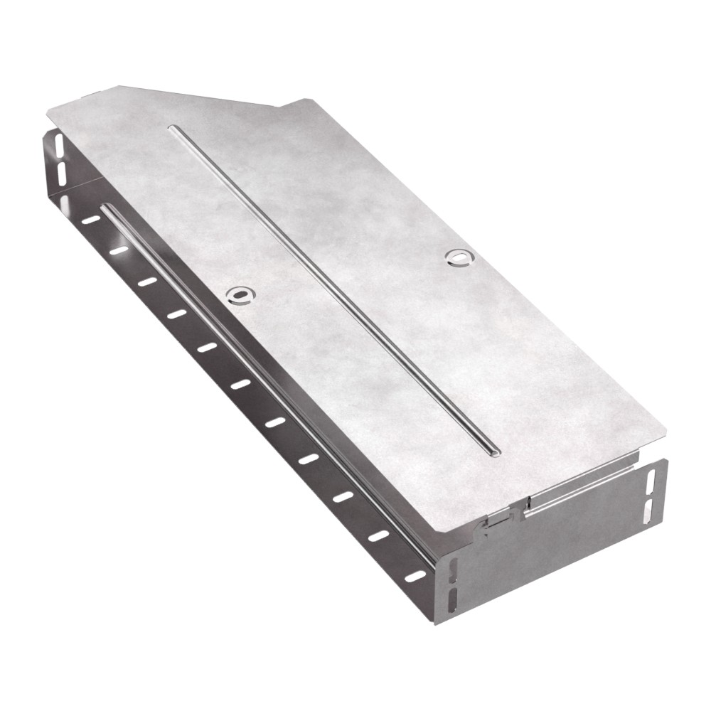 Аксессуары изготовленные из стали с защитным покрытием по методу Сендзимира – это изделия, на которых защитное цинковое покрытие было нанесено на листовую сталь перед изготовлением. Толщина защитного покрытия варьируется от 10 до 22мкм. Климатическое исполнение изделий УХЛ2, что предусматривают эксплуатацию в помещении и под навесом, при температуре эксплуатации от -80 до +150°С. Переходник правый предназначен для перехода с одной ширины лотка на другую. В комплект входит крышка.