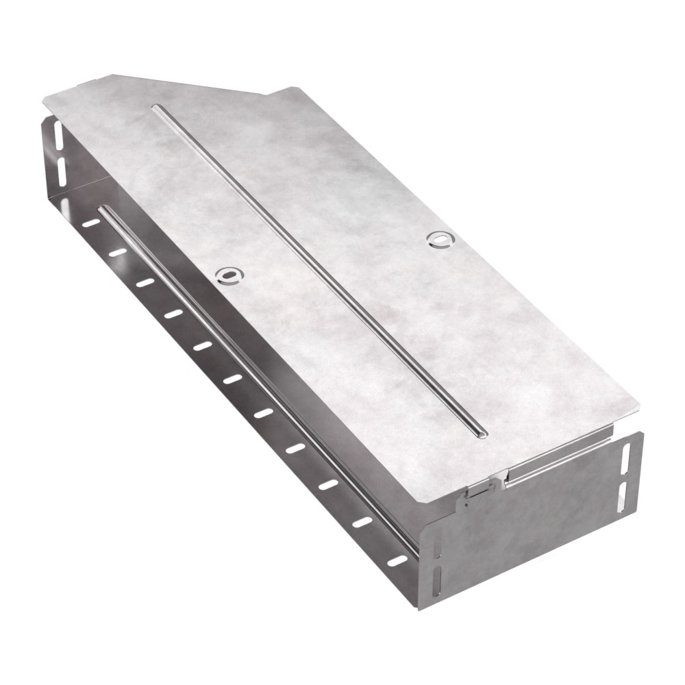 Аксессуары изготовленные из стали с защитным покрытием по методу Сендзимира – это изделия, на которых защитное цинковое покрытие было нанесено на листовую сталь перед изготовлением. Толщина защитного покрытия варьируется от 10 до 22мкм. Климатическое исполнение изделий УХЛ2, что предусматривают эксплуатацию в помещении и под навесом, при температуре эксплуатации от -80 до +150°С. Переходник правый предназначен для перехода с одной ширины лотка на другую. В комплект входит крышка.