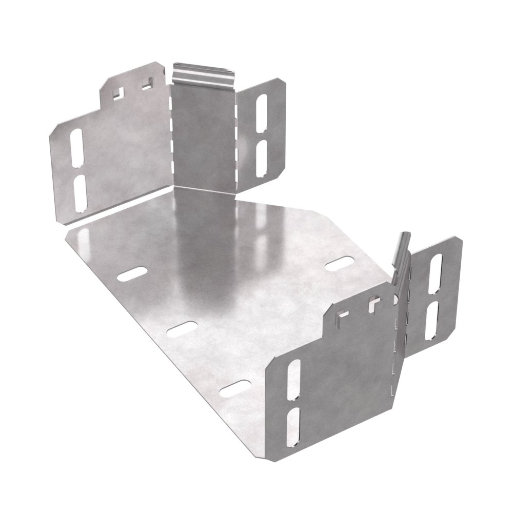 Аксессуары изготовленные из стали с защитным покрытием по методу Сендзимира – это изделия, на которых защитное цинковое покрытие было нанесено на листовую сталь перед изготовлением. Толщина защитного покрытия варьируется от 10 до 22мкм. Климатическое исполнение изделий УХЛ2, что предусматривают эксплуатацию в помещении и под навесом, при температуре эксплуатации от -80 до +150°С. Переходник симметричный предназначен для перехода с одной ширины лотка на другую, при неизменной высоте лотка. Крышка в комплект не входит.