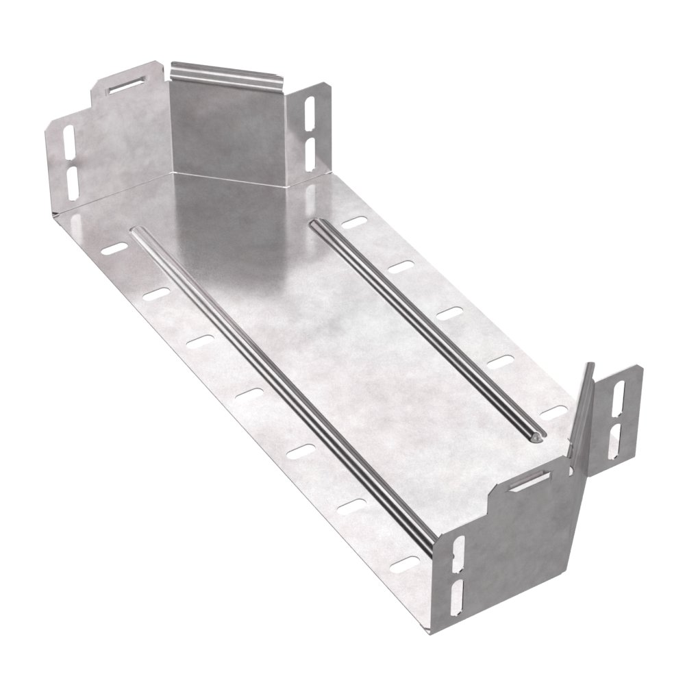 Аксессуары изготовленные из стали с защитным покрытием по методу Сендзимира – это изделия, на которых защитное цинковое покрытие было нанесено на листовую сталь перед изготовлением. Толщина защитного покрытия варьируется от 10 до 22мкм. Климатическое исполнение изделий УХЛ2, что предусматривают эксплуатацию в помещении и под навесом, при температуре эксплуатации от -80 до +150°С. Переходник симметричный предназначен для перехода с одной ширины лотка на другую, при неизменной высоте лотка. Крышка в комплект не входит.