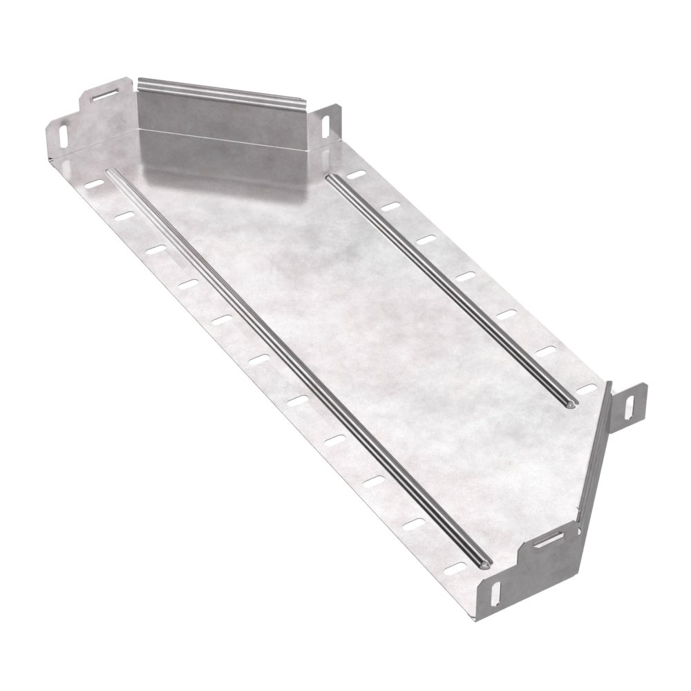 Аксессуары изготовленные из стали с защитным покрытием по методу Сендзимира – это изделия, на которых защитное цинковое покрытие было нанесено на листовую сталь перед изготовлением. Толщина защитного покрытия варьируется от 10 до 22мкм. Климатическое исполнение изделий УХЛ2, что предусматривают эксплуатацию в помещении и под навесом, при температуре эксплуатации от -80 до +150°С. Переходник симметричный предназначен для перехода с одной ширины лотка на другую, при неизменной высоте лотка. Крышка в комплект не входит.