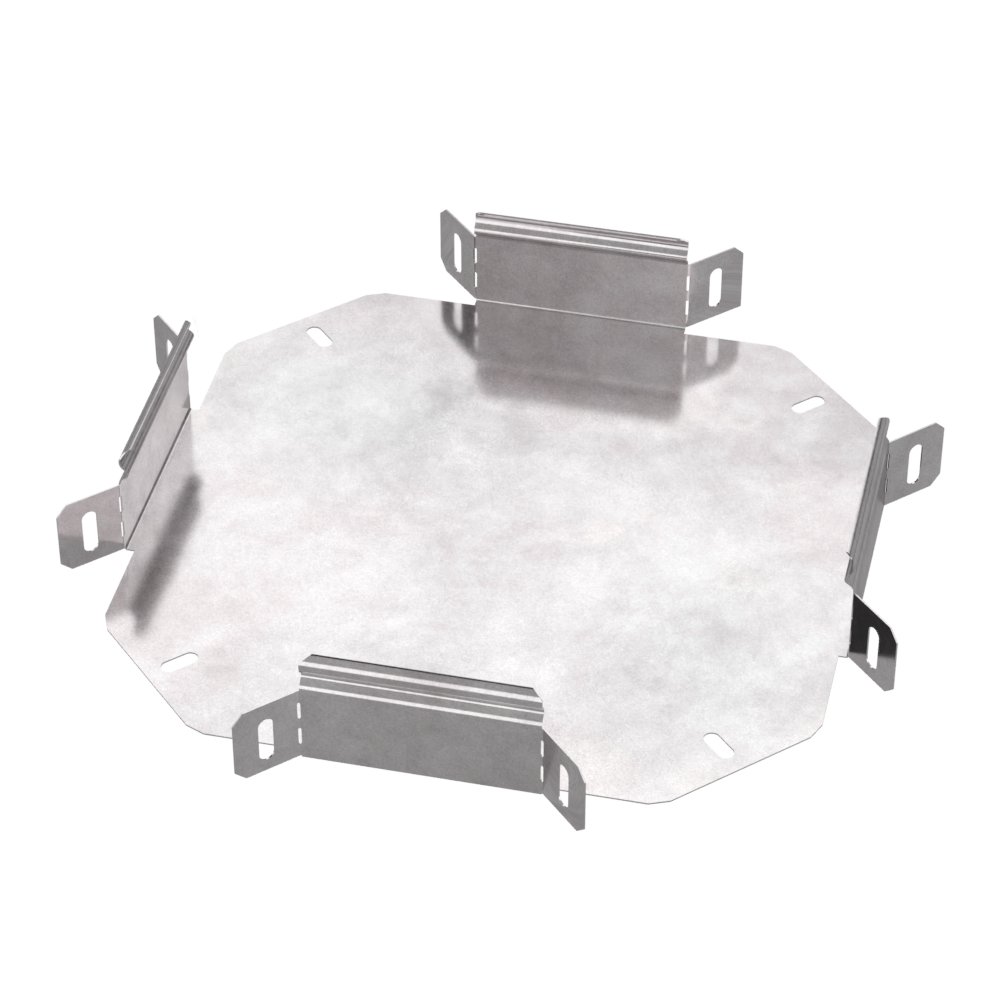 Аксессуары изготовленные из стали с защитным покрытием по методу Сендзимира – это изделия, на которых защитное цинковое покрытие было нанесено на листовую сталь перед изготовлением. Толщина защитного покрытия варьируется от 10 до 22мкм. Климатическое исполнение изделий УХЛ2, что предусматривают эксплуатацию в помещении и под навесом, при температуре эксплуатации от -80 до +150°С. Ответвитель X-образный предназначен для разветвления кабельных трасс в горизонтальном направлении, для перфорированных и глухих лотков. В комплект не входит крышка.