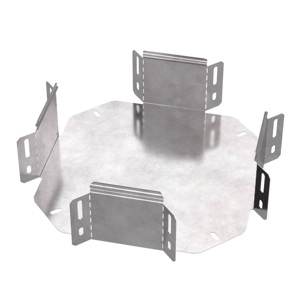 Аксессуары изготовленные из стали с защитным покрытием по методу Сендзимира – это изделия, на которых защитное цинковое покрытие было нанесено на листовую сталь перед изготовлением. Толщина защитного покрытия варьируется от 10 до 22мкм. Климатическое исполнение изделий УХЛ2, что предусматривают эксплуатацию в помещении и под навесом, при температуре эксплуатации от -80 до +150°С. Ответвитель X-образный предназначен для разветвления кабельных трасс в горизонтальном направлении, для перфорированных и глухих лотков. В комплект не входит крышка.