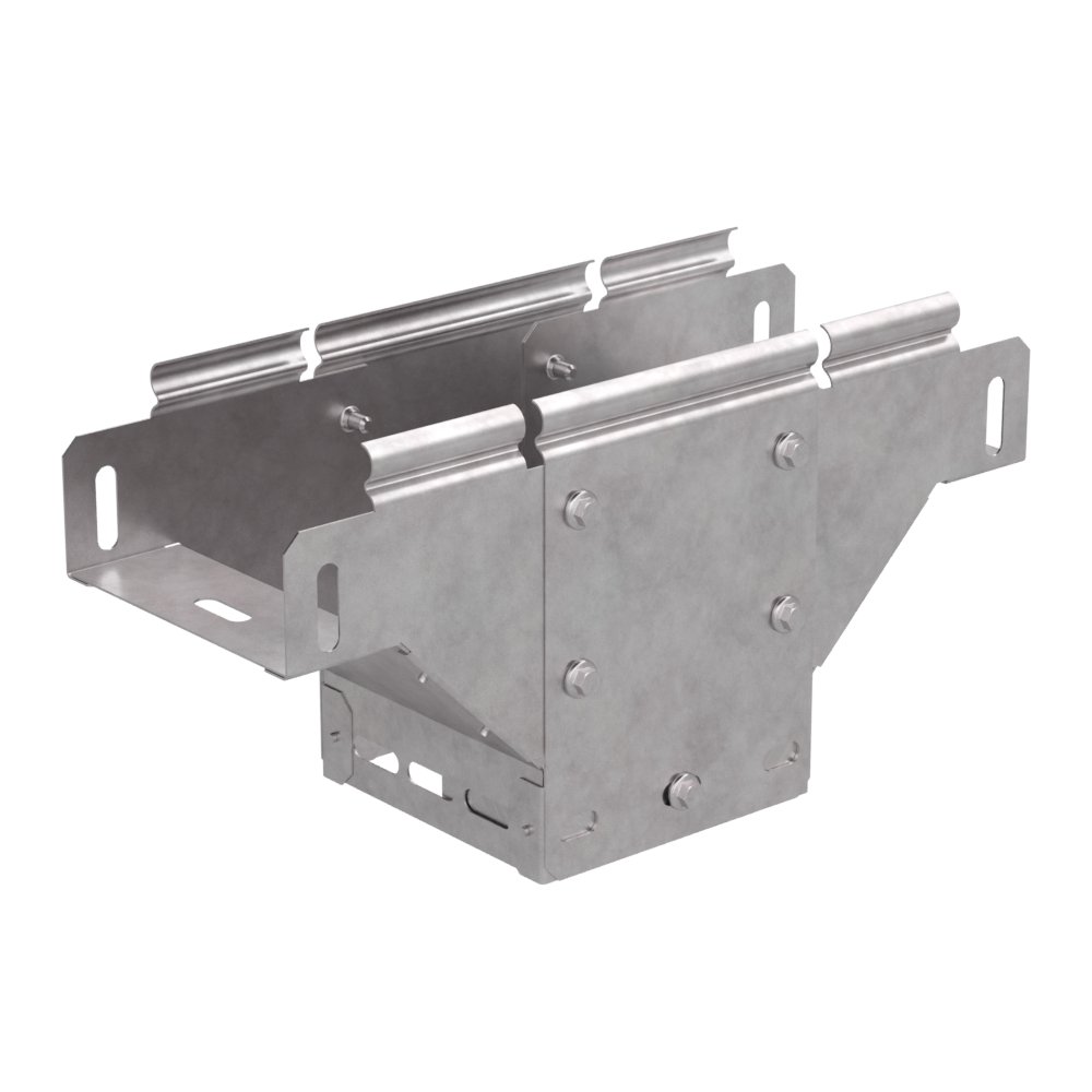 Аксессуары изготовленные из стали с защитным покрытием по методу Сендзимира – это изделия, на которых защитное цинковое покрытие было нанесено на листовую сталь перед изготовлением. Толщина защитного покрытия варьируется от 10 до 22мкм. Климатическое исполнение изделий УХЛ2, что предусматривают эксплуатацию в помещении и под навесом, при температуре эксплуатации от -80 до +150°С. Ответвитель Т-образный вертикальный применяется для обеспечения полноразмерного ответвления горизонтальной кабеленесущей системы из лотков металлических в вертикальном направлении.