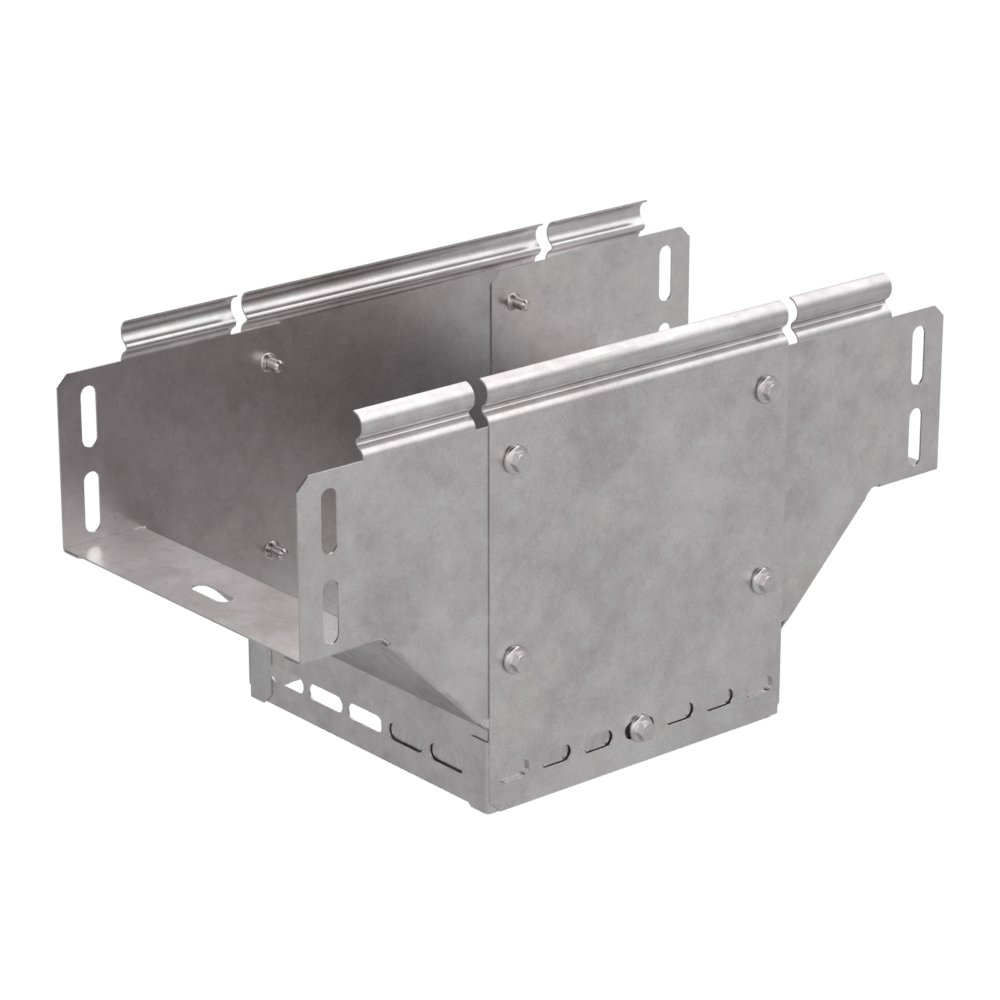 Аксессуары изготовленные из стали с защитным покрытием по методу Сендзимира – это изделия, на которых защитное цинковое покрытие было нанесено на листовую сталь перед изготовлением. Толщина защитного покрытия варьируется от 10 до 22мкм. Климатическое исполнение изделий УХЛ2, что предусматривают эксплуатацию в помещении и под навесом, при температуре эксплуатации от -80 до +150°С. Ответвитель Т-образный вертикальный применяется для обеспечения полноразмерного ответвления горизонтальной кабеленесущей системы из лотков металлических в вертикальном направлении.