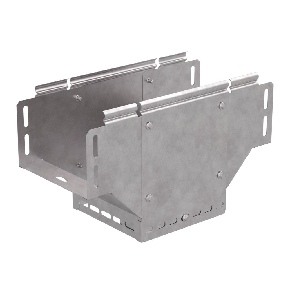 Аксессуары изготовленные из стали с защитным покрытием по методу Сендзимира – это изделия, на которых защитное цинковое покрытие было нанесено на листовую сталь перед изготовлением. Толщина защитного покрытия варьируется от 10 до 22мкм. Климатическое исполнение изделий УХЛ2, что предусматривают эксплуатацию в помещении и под навесом, при температуре эксплуатации от -80 до +150°С. Ответвитель Т-образный вертикальный применяется для обеспечения полноразмерного ответвления горизонтальной кабеленесущей системы из лотков металлических в вертикальном направлении.
