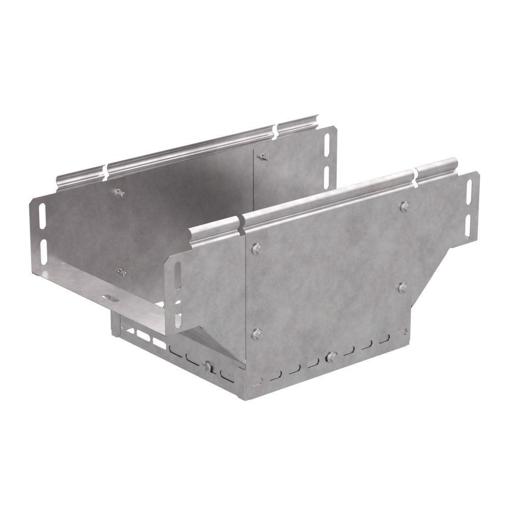 Аксессуары изготовленные из стали с защитным покрытием по методу Сендзимира – это изделия, на которых защитное цинковое покрытие было нанесено на листовую сталь перед изготовлением. Толщина защитного покрытия варьируется от 10 до 22мкм. Климатическое исполнение изделий УХЛ2, что предусматривают эксплуатацию в помещении и под навесом, при температуре эксплуатации от -80 до +150°С. Ответвитель Т-образный вертикальный применяется для обеспечения полноразмерного ответвления горизонтальной кабеленесущей системы из лотков металлических в вертикальном направлении.