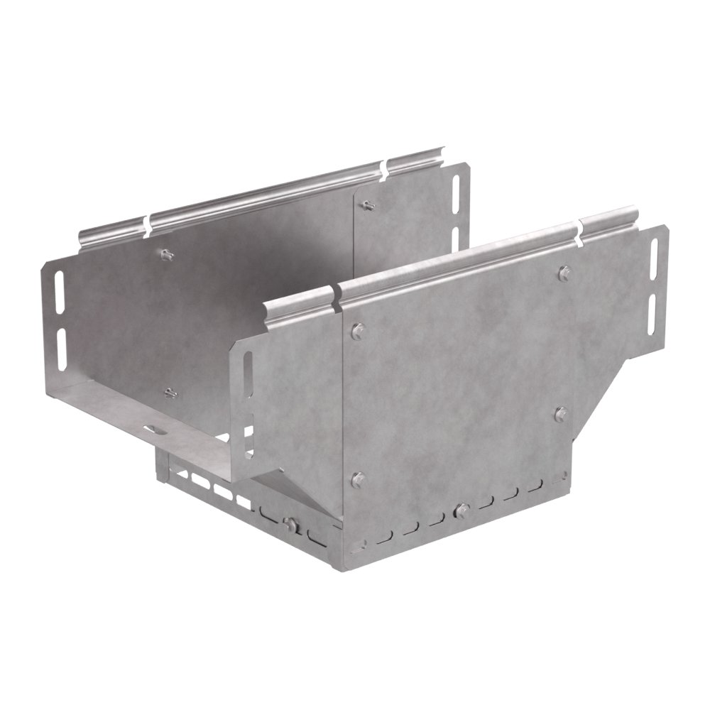 Аксессуары изготовленные из стали с защитным покрытием по методу Сендзимира – это изделия, на которых защитное цинковое покрытие было нанесено на листовую сталь перед изготовлением. Толщина защитного покрытия варьируется от 10 до 22мкм. Климатическое исполнение изделий УХЛ2, что предусматривают эксплуатацию в помещении и под навесом, при температуре эксплуатации от -80 до +150°С. Ответвитель Т-образный вертикальный применяется для обеспечения полноразмерного ответвления горизонтальной кабеленесущей системы из лотков металлических в вертикальном направлении.