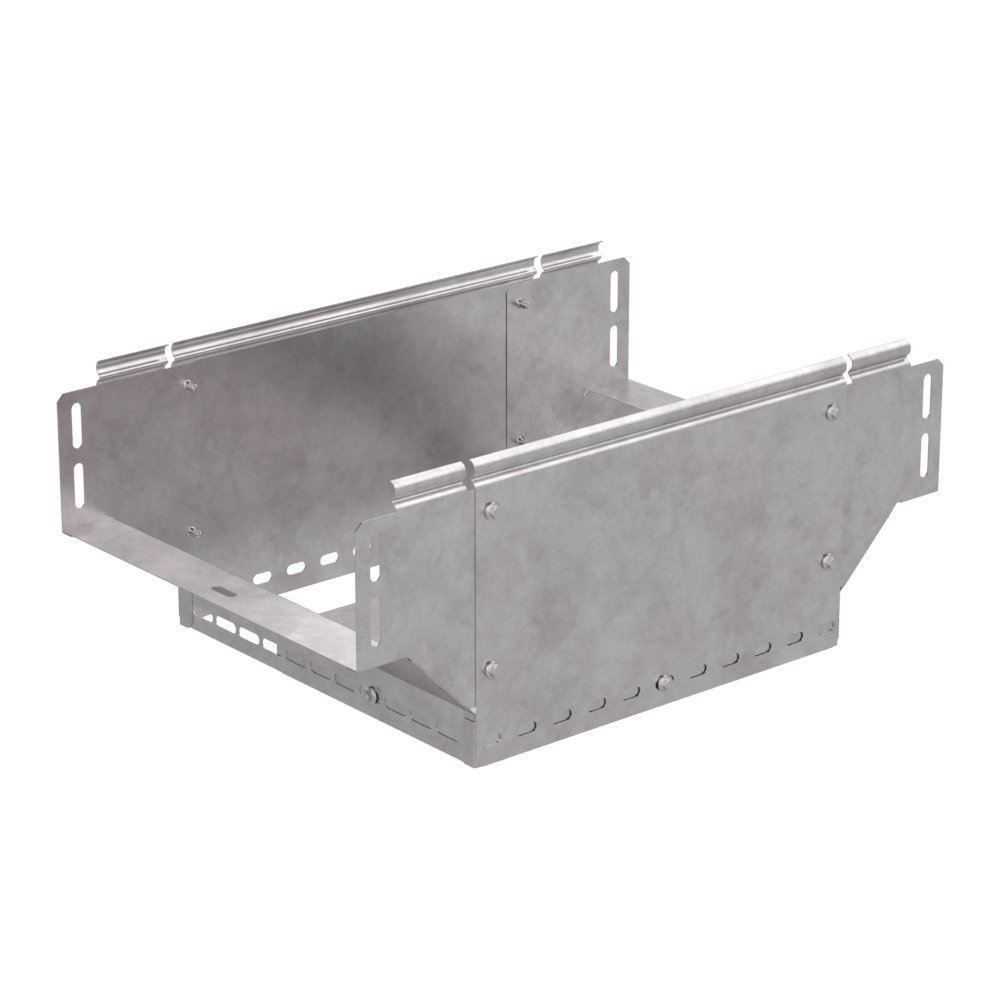 Аксессуары изготовленные из стали с защитным покрытием по методу Сендзимира – это изделия, на которых защитное цинковое покрытие было нанесено на листовую сталь перед изготовлением. Толщина защитного покрытия варьируется от 10 до 22мкм. Климатическое исполнение изделий УХЛ2, что предусматривают эксплуатацию в помещении и под навесом, при температуре эксплуатации от -80 до +150°С. Ответвитель Т-образный вертикальный применяется для обеспечения полноразмерного ответвления горизонтальной кабеленесущей системы из лотков металлических в вертикальном направлении.