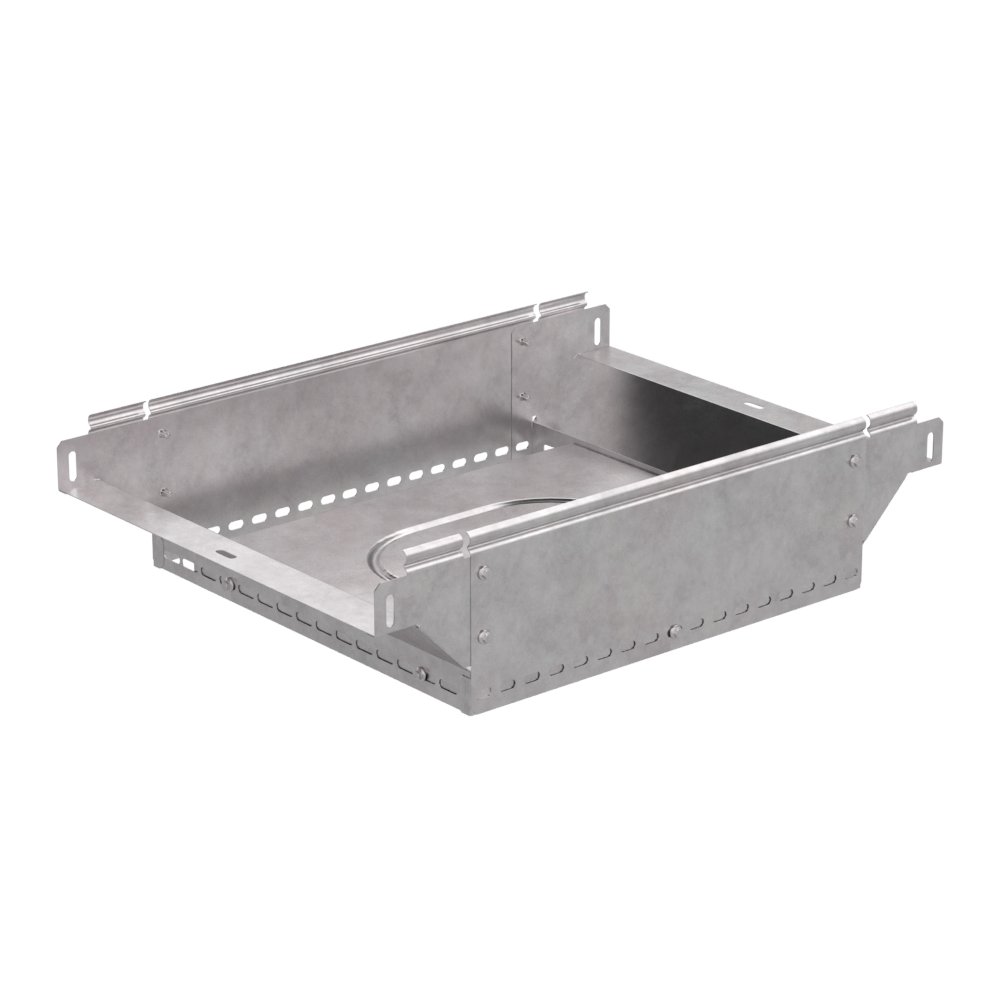 Аксессуары изготовленные из стали с защитным покрытием по методу Сендзимира – это изделия, на которых защитное цинковое покрытие было нанесено на листовую сталь перед изготовлением. Толщина защитного покрытия варьируется от 10 до 22мкм. Климатическое исполнение изделий УХЛ2, что предусматривают эксплуатацию в помещении и под навесом, при температуре эксплуатации от -80 до +150°С. Ответвитель Т-образный вертикальный применяется для обеспечения полноразмерного ответвления горизонтальной кабеленесущей системы из лотков металлических в вертикальном направлении.